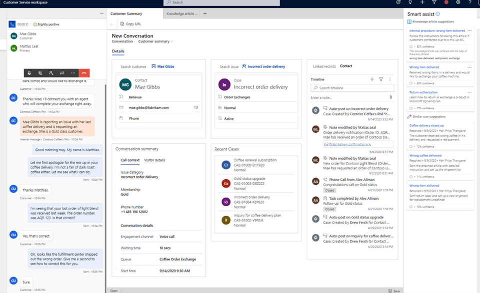 The solution includes built-in AI capabilities, known as Copilot in Dynamics 365 Customer Service, that leverage data from client interactions and cases. The intelligent system provides actionable insights, flags emerging trends, and more. For example, AI functionality can provide real-time suggestions, based on similar cases, or provide customers with next best actions on cases, increasing efficiency and case resolution rates.