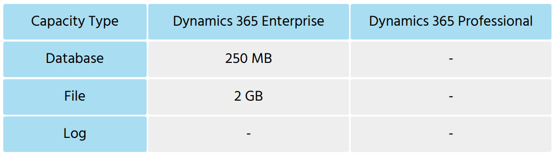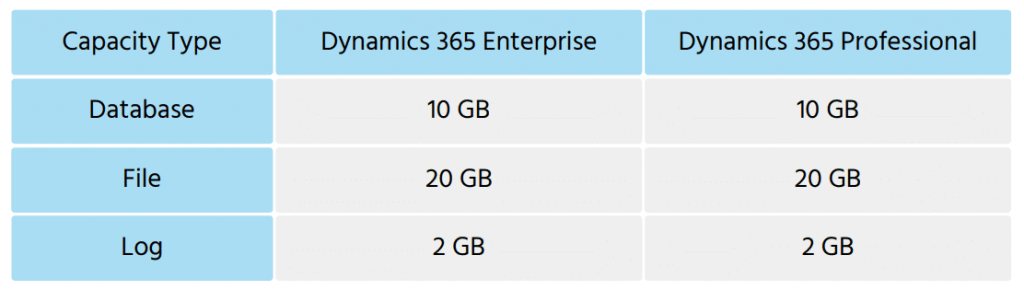 Additional Dynamics 365 Enterprise user licences purchased accrue additional storage capacity: