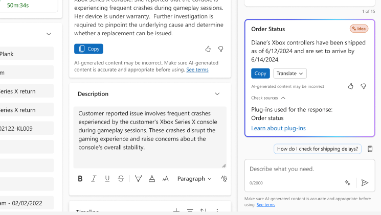 Customer service cases, especially complicated ones, often go through various agents. Because of this, agents may spend significant time understanding the current status of a case and the progress made towards its resolution. Copilot empowers customer service agents to summarise cases with a simple click of a button. The summary generated provides an overview of key issues, actions taken, and outcomes achieved, enabling agents to quickly understand where a case stands and the next actions needed.