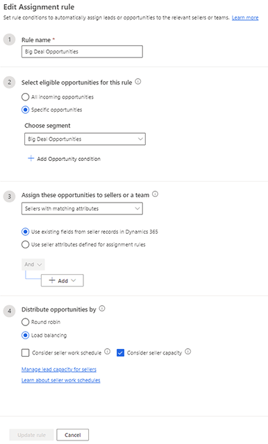 - Assign leads and opportunities to sellers depending on the attributes of the cases (Eg: Where the case came from, estimated revenue, lead score)