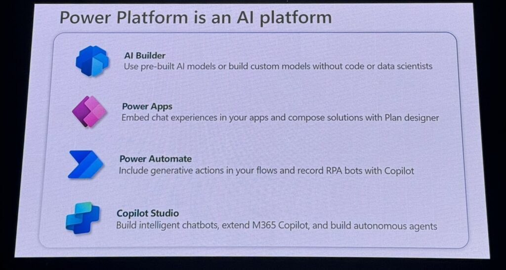 Another talk we attended was all about the Power Platform and AI. Now you might be thinking, the Power Platform isn’t a new thing, and you’re right, it’s been around for several years now and here at Pragmatiq, it plays a strong role in most of our projects. What made this talk particularly interesting was the perspective shared by Rueben Krippner, Director of Power Platform at Microsoft. He highlighted that while AI has been part of the Power Platform for some time, the introduction of Copilot capabilities takes the platform to new heights, offering even more potential for innovation and functionality.