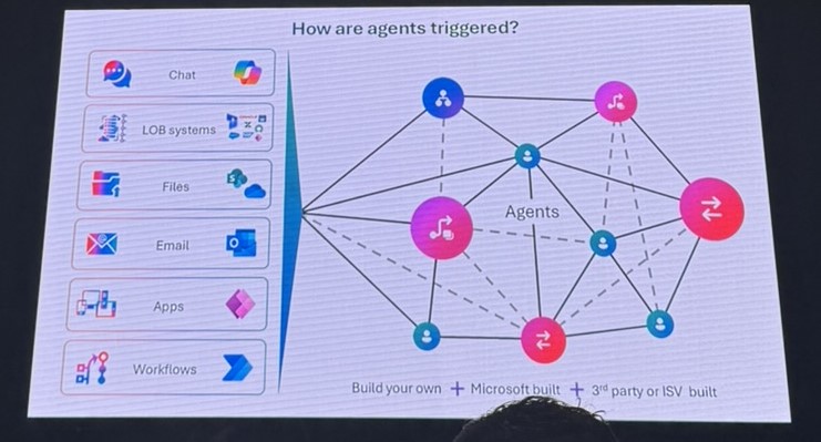 This means we will go beyond basic commands (do this + the copilot acts), to a more autonomous approach with agents able to be triggered in multiple ways, as demonstrated by the slide image below. It will operate like a team, each agent with distinct roles and responsibilities, working collaboratively and driving processes forward with minimal intervention. Essentially, it will act like a human; it has a job description, it knows where to get the knowledge and it can take action independently. If we consider the business value, this reduces single points of ownership and ultimately alleviates risks and challenges that come with this.