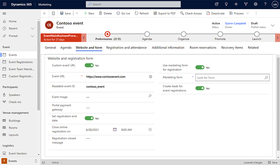 - To ensure information related to a particular event is stored in the right place, Dynamics 365 will automatically record data such as registrations, attendance, audience engagement, etc. This makes it easier to identify potential donors and allows you to leverage this information in future campaigns