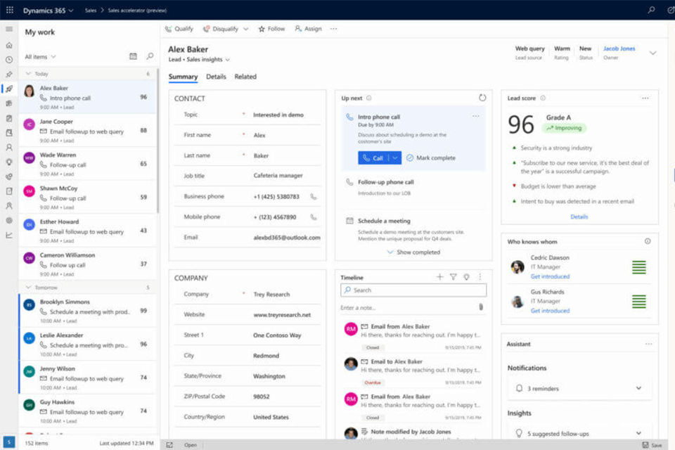 - Pros: Dynamics 365’s unified interface seamlessly integrates with Microsoft 365, Power BI, Azure, Teams, SharePoint and other third-party applications (i.e. Qlik, Mailchimp, Xero etc.)