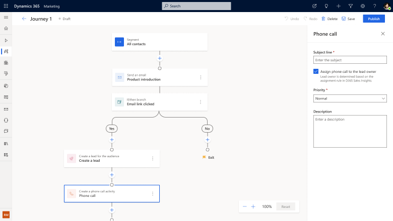 When nurturing leads and opportunities with real-time journeys, you might want your sales team to engage with a particular lead quickly. Within Dynamics 365 Marketing, sales activities (such as tasks and phone calls) can now be created directly from journeys.