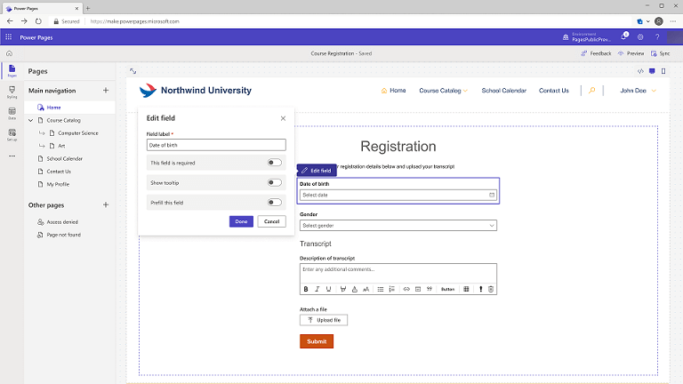 Users can build and configure basic forms from the Power Pages design studio, with capabilities including: