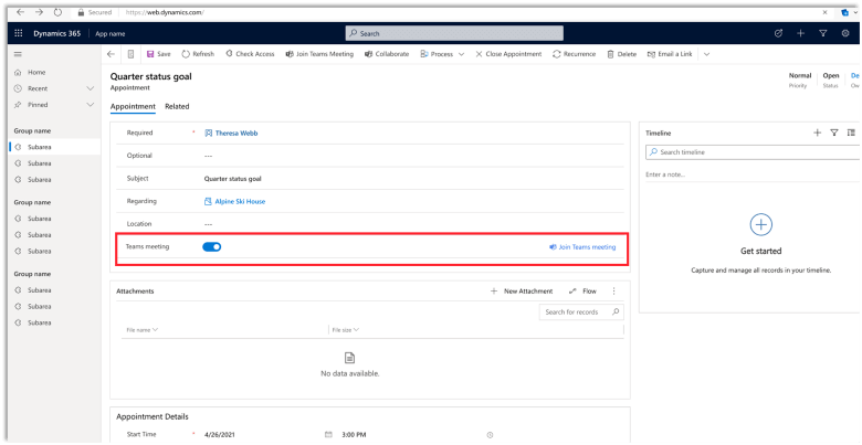 Users can add Microsoft Teams meetings from an appointment in a model-driven app. You can also join a Teams meeting with a single button-click from the appointment or the timeline control.