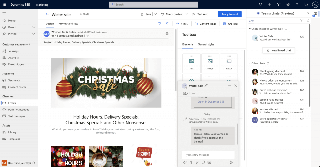 When it comes to working on marketing content and customer journeys, you are often required to work as part of a team and collaborate on various areas. With built-in Microsoft Teams chat, users can easily collaborate with other team members without leaving the journey canvas or email editing experience.
